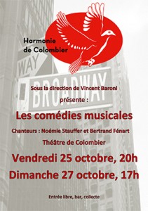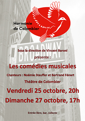 Les vendredi 25 octobre à 20h et dimanche 27 octobre à 17h, nous vous invitons à revisiter les comédies musicales les plus connues. Pour cela, nous aurons la chance d’être accompagnés de Noémie Stauffer et Bertrand Fénart qui nous ont déjà enchantés à d’autres occasions.