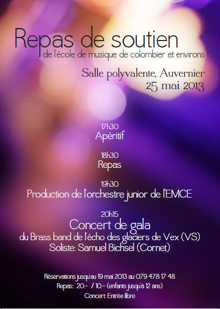 Samedi 25 mai, à la salle polyvalente d’Auvernier, souper en faveur de notre école de musique, suivi d’un concert de gala par le Brass Band d’excellence L’Echo des Glaciers de Vex, Samuel Bichsel en soliste. Entrée libre, collecte.